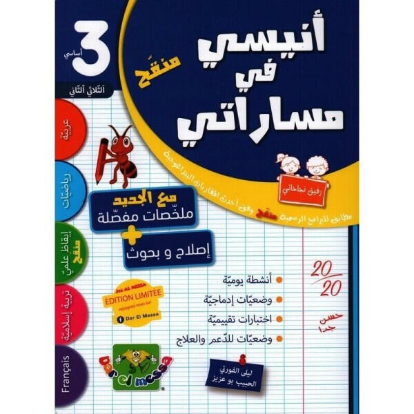 الوصف: "أنيسي في مساراتي - السنة الثالثة - الثلاثي الثاني" هو كتاب تعليمي مصمم خصيصًا لتلاميذ السنة الثالثة من التعليم الأساسي، يهدف إلى تعزيز مهاراتهم الأكاديمية والتحضير الجيد للامتحانات الفصلية. يتضمن الكتاب مجموعة متنوعة من التمارين والأنشطة التي تغطي كافة المواد الدراسية بشكل شامل، مع التركيز على تقديم أسئلة تدريبية تحاكي الامتحانات بشكل مباشر، مما يساعد الطلاب في تقييم مستواهم الأكاديمي وتحسينه.